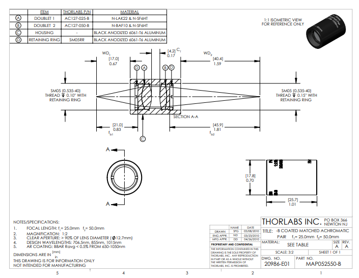 Thorlabs索雷博     MAP052550-B   匹配消色差双胶合透镜对