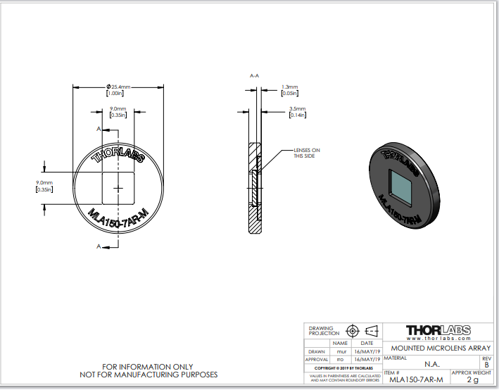 Thorlabs索雷博 MLA150-7AR-M 透镜阵列
