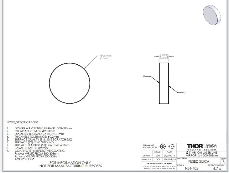 Thorlabs索雷博 NB1-K05 氩离子激光反射镜
