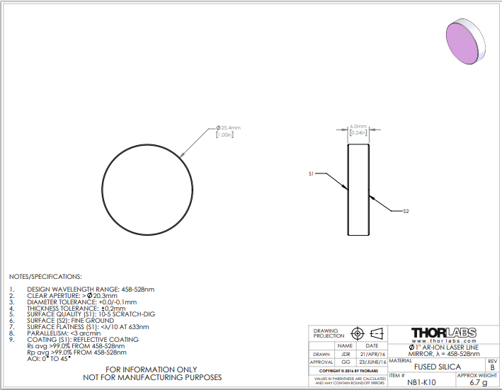 Thorlabs索雷博 NB1-K10 氩离子激光镜