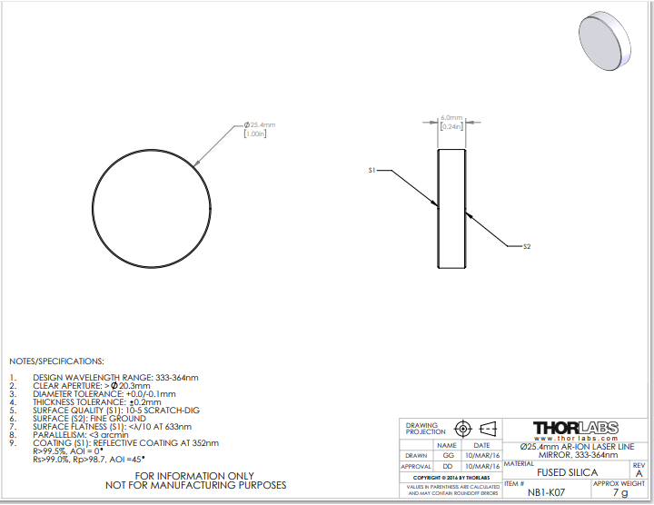 Thorlabs索雷博 NB1-K07 氩离子激光镜