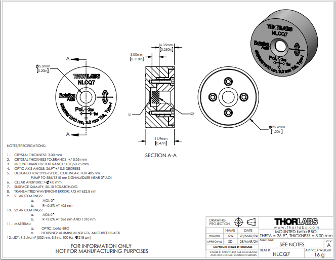 Thorlabs索雷博 NLCQ7 - 已安装的β-BBO晶体