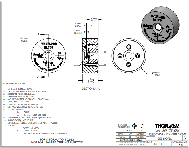 Thorlabs索雷博 NLC08 - 已安装的β-BBO晶体