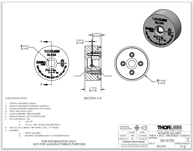 Thorlabs索雷博 NLC03 - 已安装的β-BBO晶体