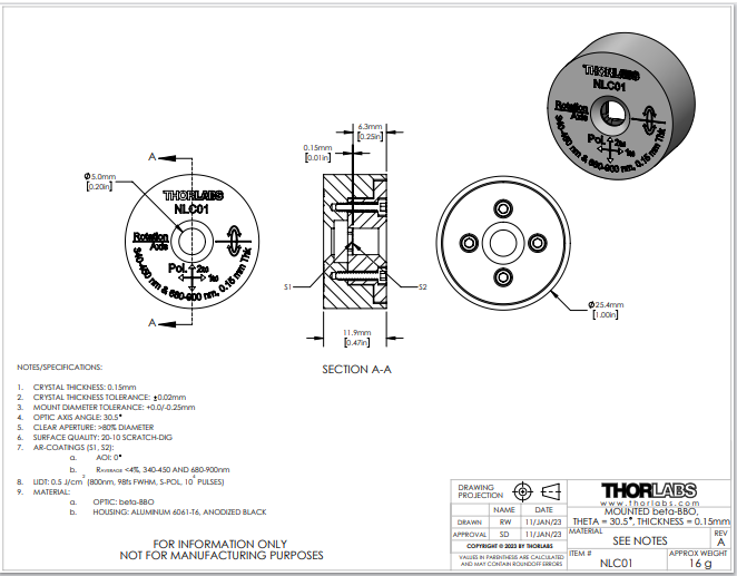 Thorlabs索雷博 NLC01 - 已安装的β-BBO晶体