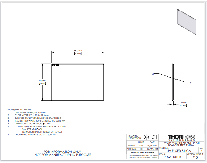 Thorlabs索雷博     PBSW-1310R - 偏振平板分束镜
