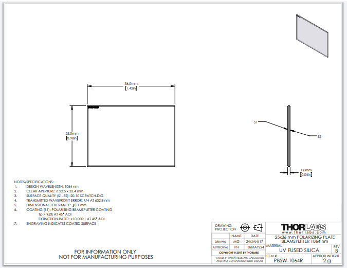 Thorlabs索雷博     PBSW-1064R - 偏振平板分束镜
