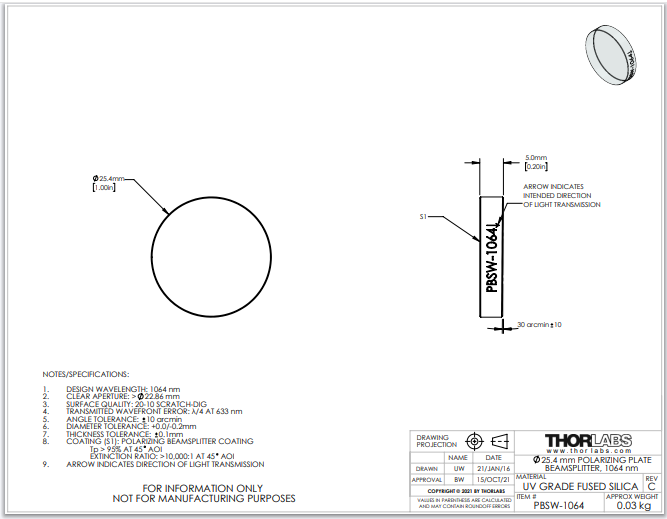 Thorlabs索雷博 PBSW-1064 - 偏振平板分束镜