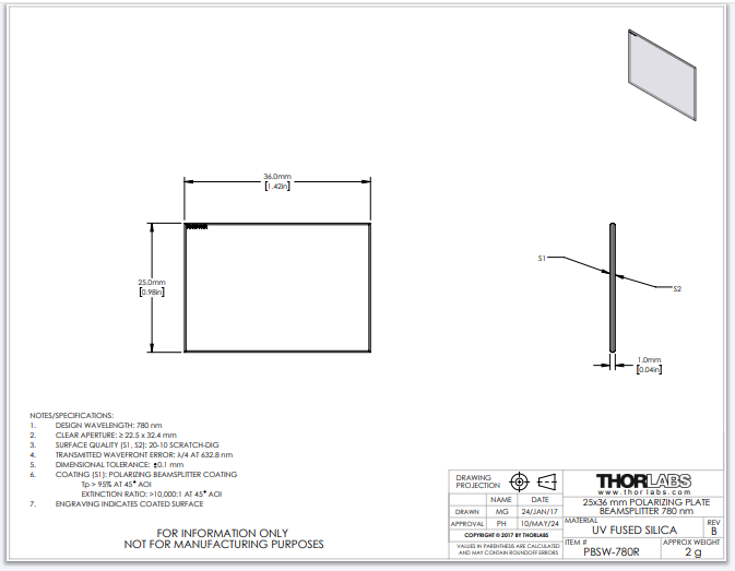Thorlabs索雷博 PBSW-780R - 偏振平板分束镜