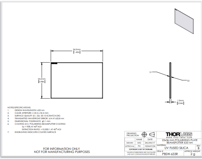 Thorlabs索雷博     PBSW-633R - 偏振平板分束镜