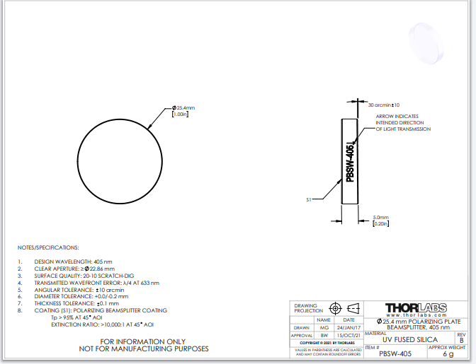 Thorlabs索雷博 PBSW-405 - 偏振平板分束镜