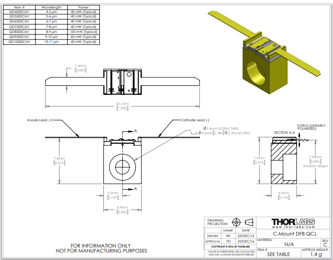 Thorlabs索雷博 QD8500CM1 - 分布反馈式量子级联激光器