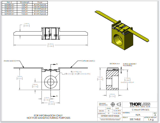 Thorlabs索雷博 QD8050CM1 - 分布反馈式量子级联激光器