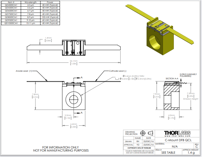 Thorlabs索雷博 QD7500CM1 - 分布反馈式量子级联激光器