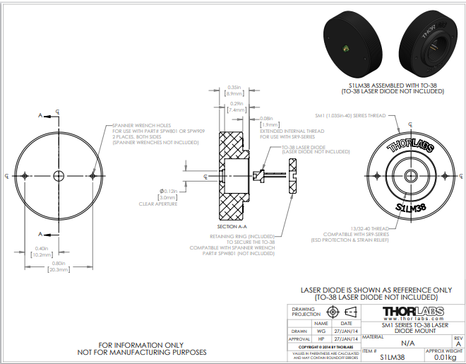Thorlabs索雷博 S1LM38 - SM1螺纹铝制安装座