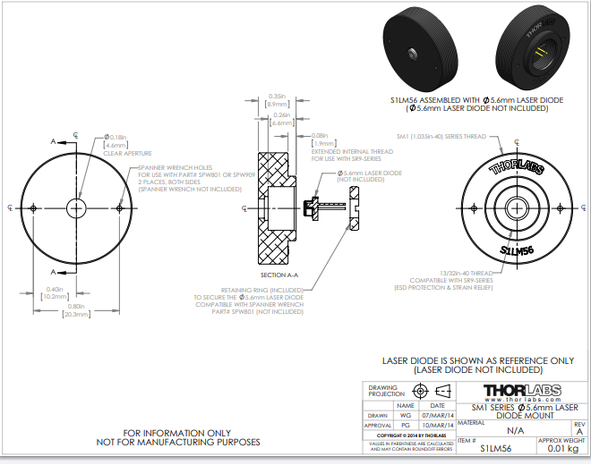 Thorlabs索雷博     S1LM56 - SM1螺纹铝制安装座