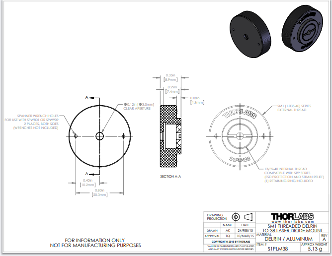 Thorlabs索雷博 S1PLM38 - SM1螺纹Delrin安装座