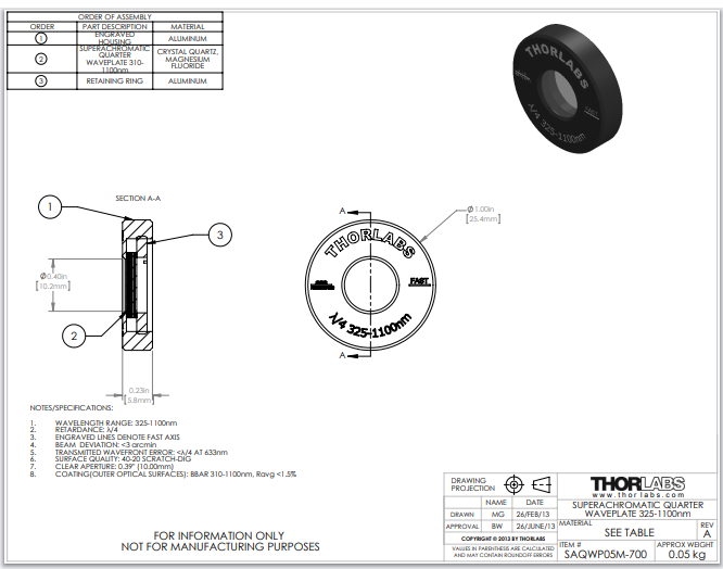 Thorlabs索雷博 SAQWP05M-700 - 超消色差四分之一波片