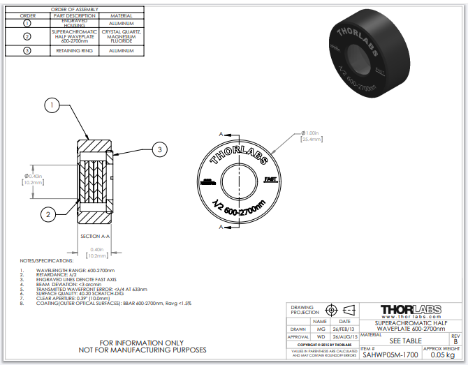 Thorlabs索雷博 SAHWP05M-1700 - 超消色差半波片
