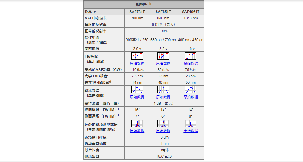 这些单角面(SAF)增益芯片设计用于外腔激光器。在放大自发辐射模式下使用,产品的使用寿命将大大缩短。