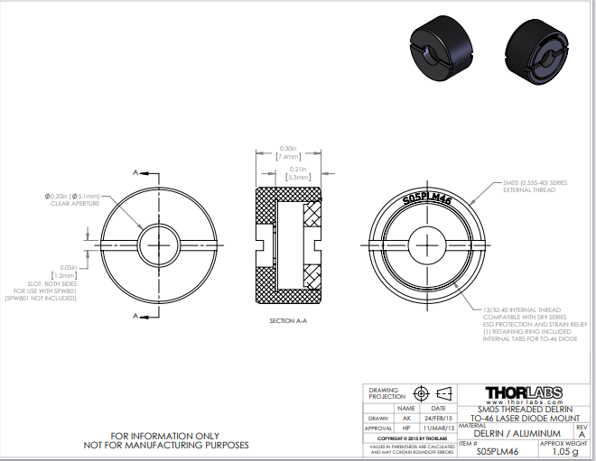Thorlabs索雷博     S05PLM46 - SM05螺纹Delrin安装座