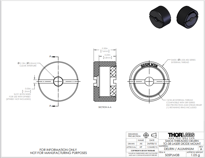 Thorlabs索雷博     S05PLM38 - SM05螺纹Delrin安装座