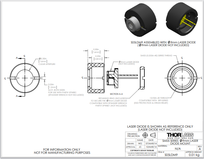 Thorlabs索雷博 S05LDM9 - SM05螺纹铝制安装座