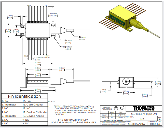 Thorlabs索雷博 SLD830S-A20W - 超辐射发光二极管