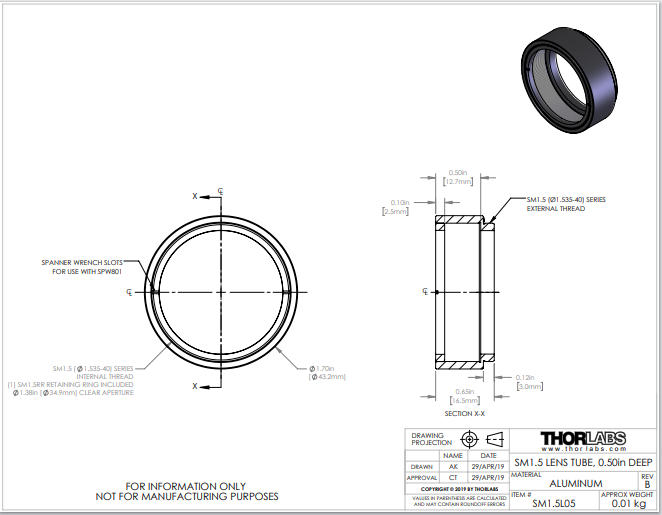 Thorlabs索雷博     SM1.5L05 - SM1.5透镜套筒