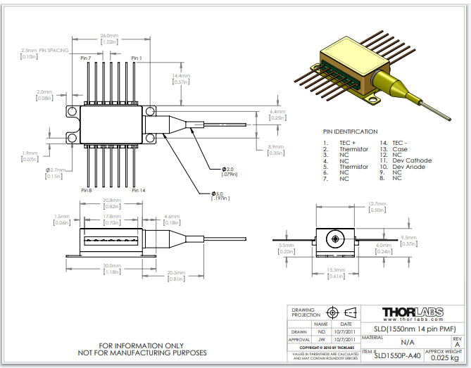 Thorlabs索雷博 SLD1550P-A40 - 超辐射发光二极管