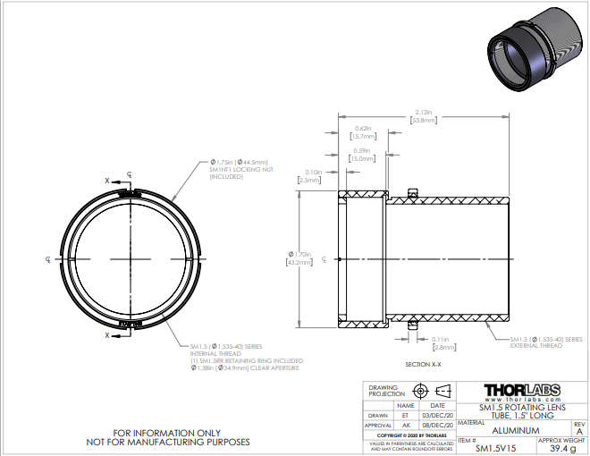 Thorlabs索雷博 SM1.5V15 - Ø1.5英寸透镜套筒