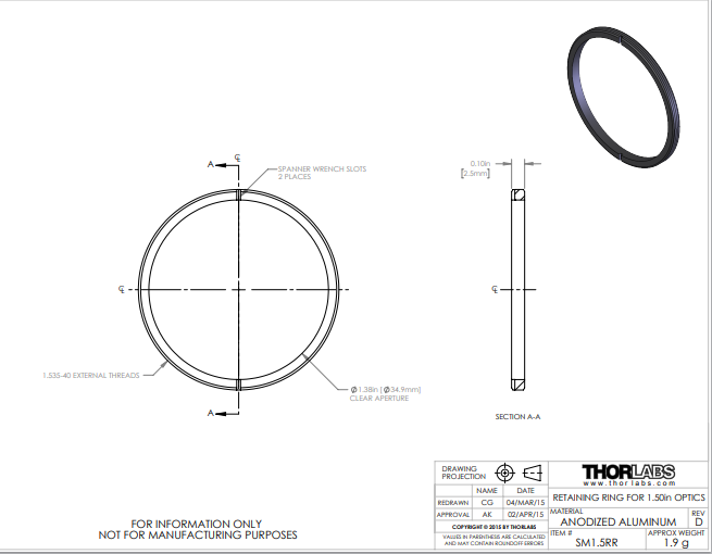 Thorlabs索雷博 SM1.5RR - SM1.5卡环,用于Ø1.5英寸透镜套筒和安装座