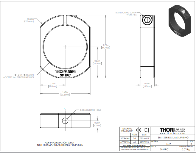 Thorlabs索雷博 SM1RC - 滑环,用于SM1透镜套筒和C-Mount延长管