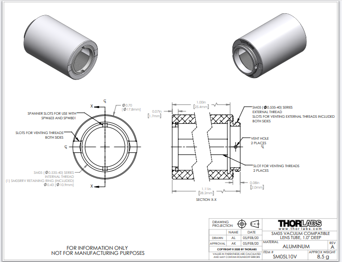 Thorlabs索雷博 SM05L10V - SM05透镜套管