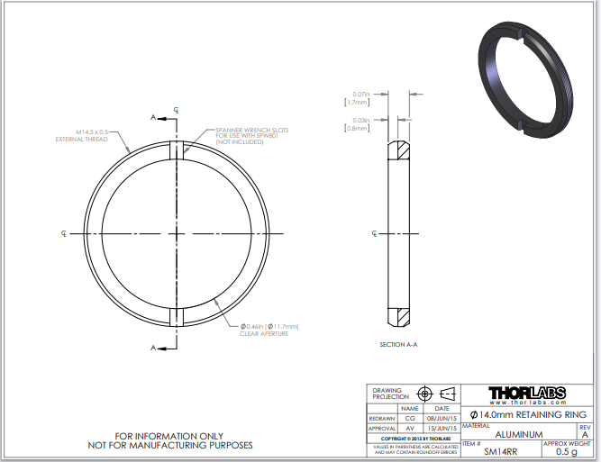 Thorlabs索雷博 SM14RR - M14.5 x 0.5卡环,用于Ø14 mm透镜安装座
