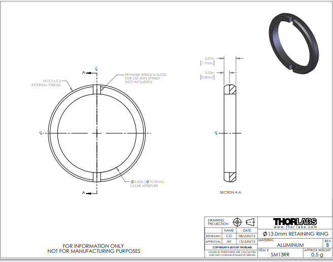 Thorlabs索雷博 SM13RR - M13.5 x 0.5卡环,用于Ø13 mm透镜安装座