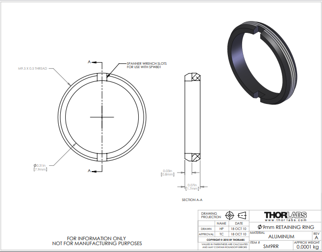 Thorlabs索雷博 SM9RR - M9.5 x 0.5卡环,用于Ø9 mm透镜安装座