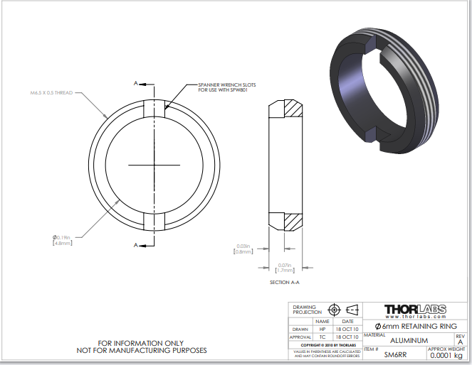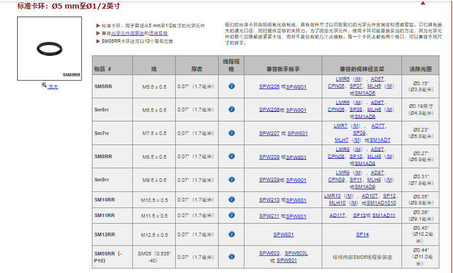 Thorlabs索雷博 SM6RR - M6.5 x 0.5卡环,用于Ø6 mm透镜安装座