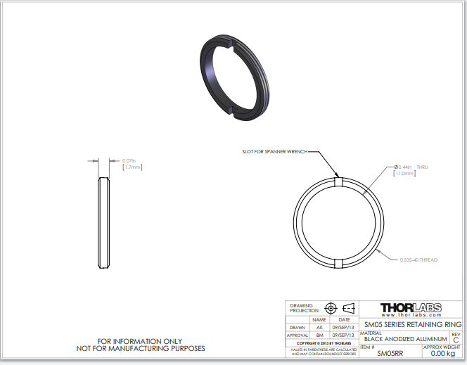 Thorlabs索雷博 SM05RR-P10 - SM05卡环,用于Ø1/2英寸透镜套管和安装座