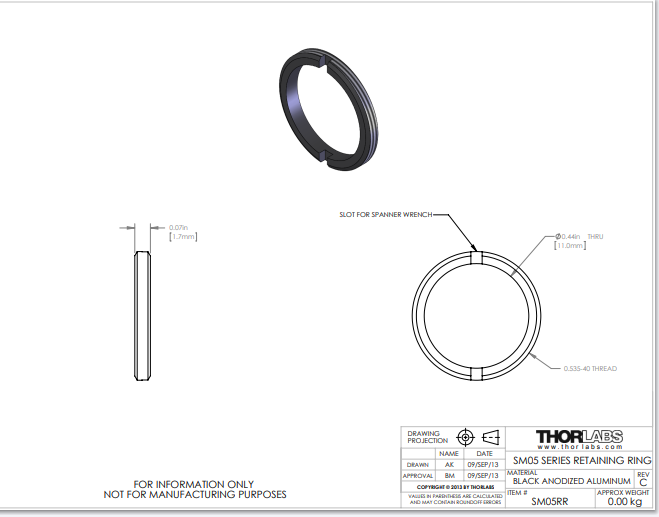 Thorlabs索雷博 SM05RR - SM05卡环,用于Ø1/2英寸透镜套管和安装座
