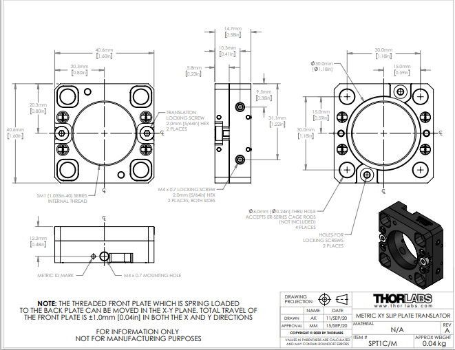 Thorlabs索雷博 SPT1C/M - XY滑板定位器