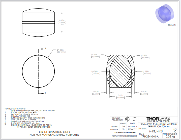 Thorlabs索雷博 TRH254-040-A 消色差三胶合透镜