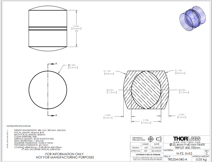 Thorlabs索雷博     TRS254-040-A   消色差三胶合透镜
