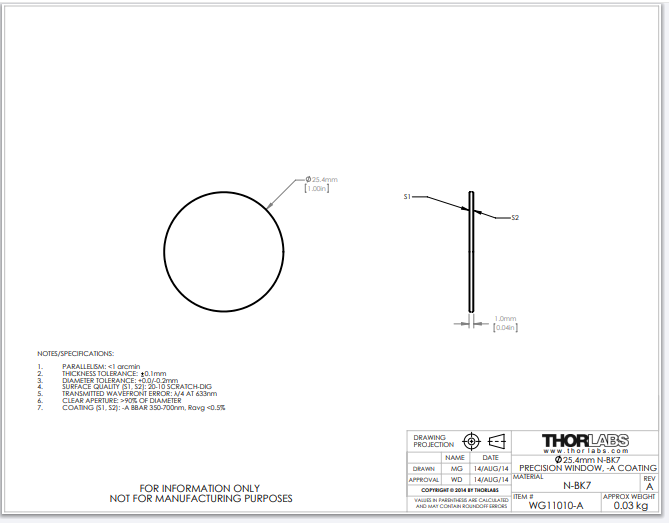 Thorlabs索雷博 WG11010-A - Ø1英寸N-BK7宽带精密窗口片
