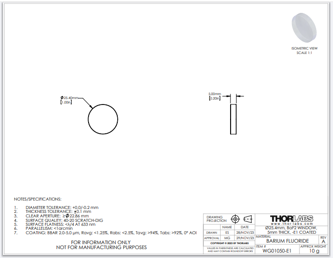 Thorlabs索雷博 WG01050-E1 - 氟化钡宽带精密窗口片