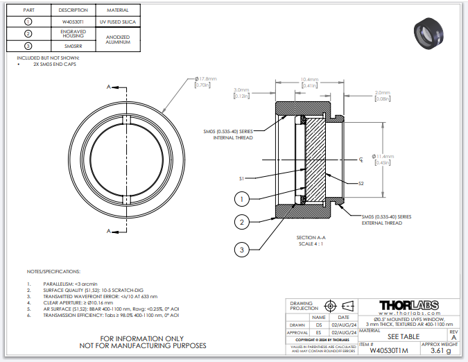 Thorlabs索雷博     W40530T1M - 增透窗口片