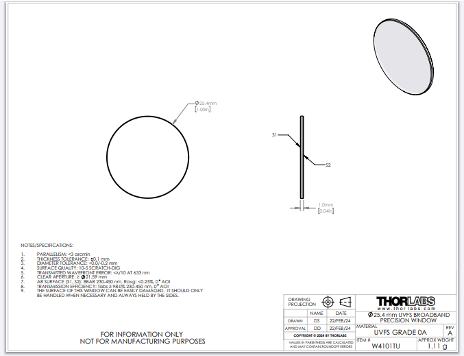 Thorlabs索雷博     W4101TU - 增透窗口片