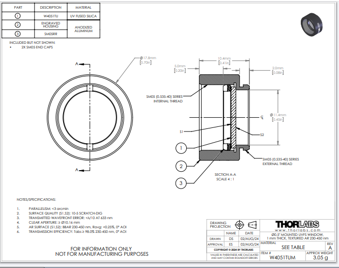 Thorlabs索雷博 W4051TUM - 增透窗口片
