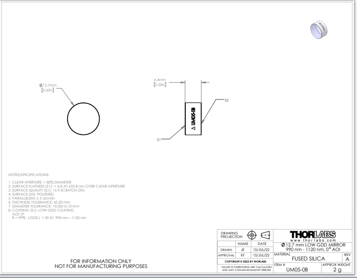 Thorlabs索雷博 UM05-0B 低GDD超快反射镜