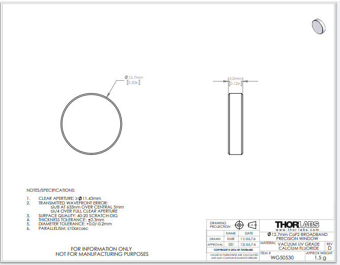 Thorlabs索雷博 WG50530 - 氟化钙宽带精密窗口片